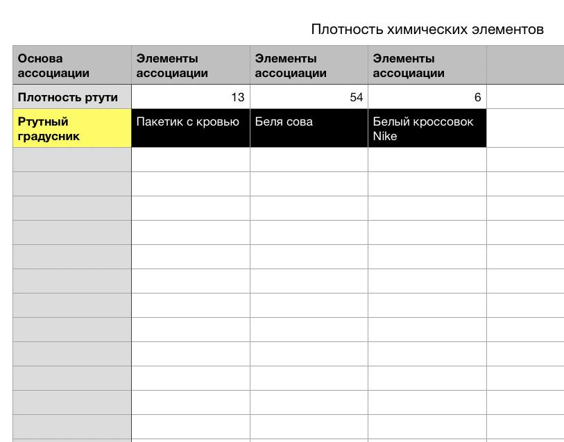 Сначала вам нужно ассоциировать основу ассоциации. Мне плотность ртути напоминает ртутный градусник. Если основа ассоциации горизонтальная, то процесс запоминания осуществляете слева направо, а если вертикальная, то сверху вниз. Для того, чтобы связать первый элемент ассоциации с частью ее основы для начала вам нужно выделить эти части.