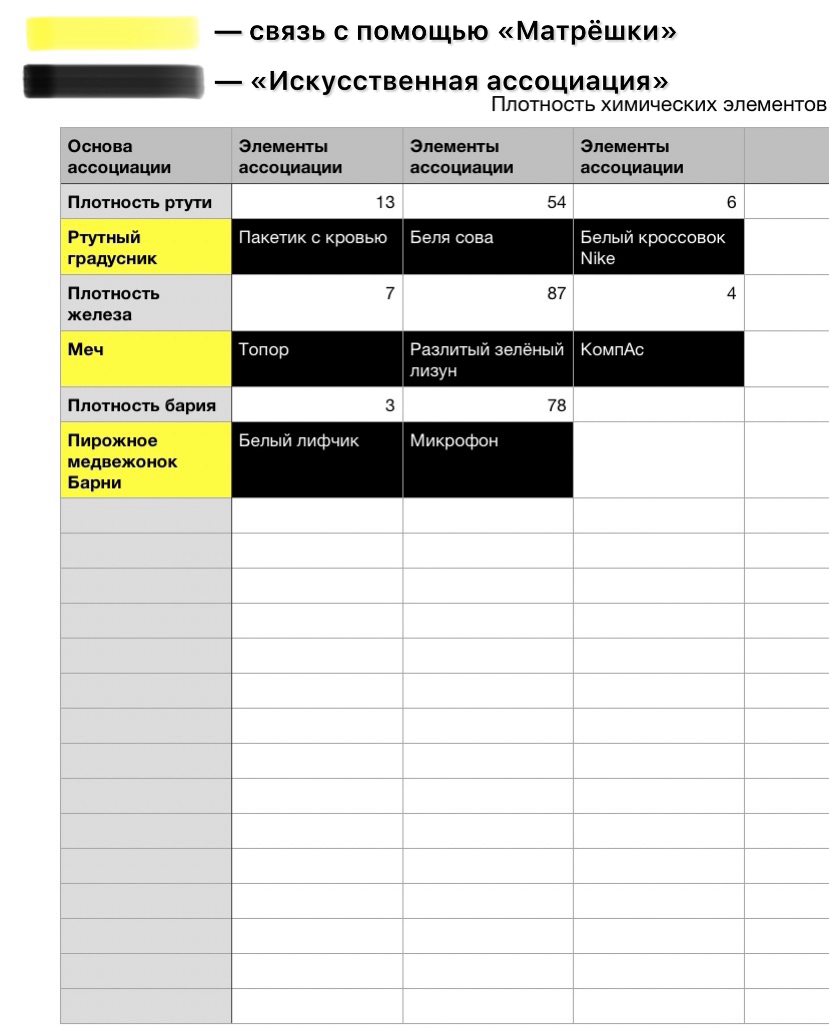 Искусственной ассоциациацией будет называться вся таблица целиком и для того, чтобы запомнить последовательность основ ассоциаций и продлить таблицу вниз, вам нужно прибегнуть к методу «Матрёшка», помещая одну основу внутрь невидимой части другой. Мысленно представьте себе внутренний стержень ртутного градусника и положите в него меч, а внутрь ручки меча засуньте шоколадный Барни.