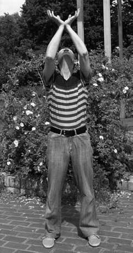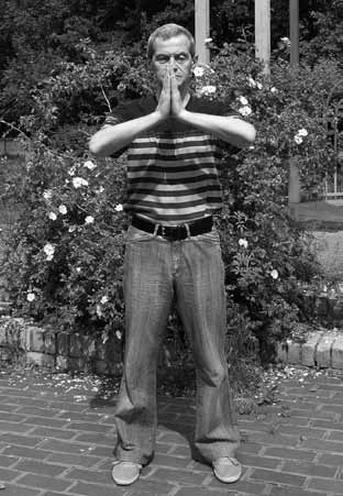 После этого соединить ладони и расслабиться, позволив им опуститься вдоль центральной линии тела примерно до уровня пупка. В нижнем положении основания ладоней расходятся, растягивая таким образом сухожилия в запястьях.