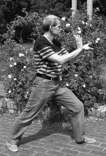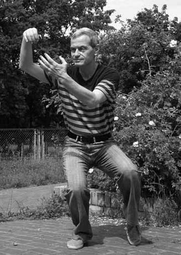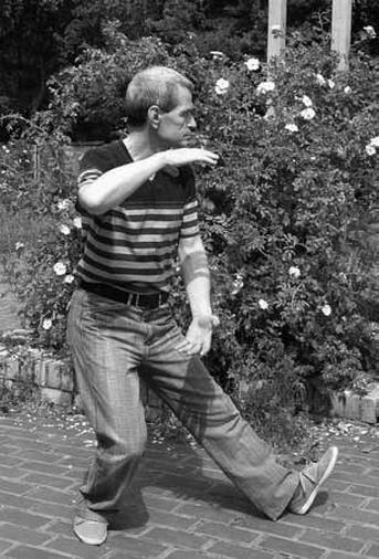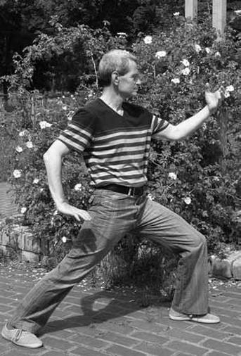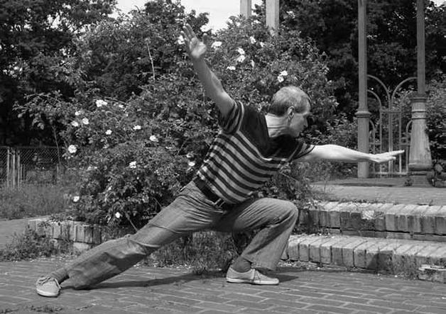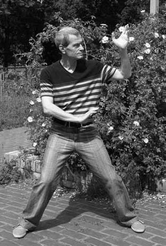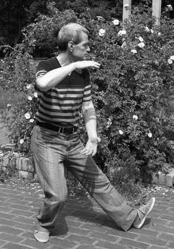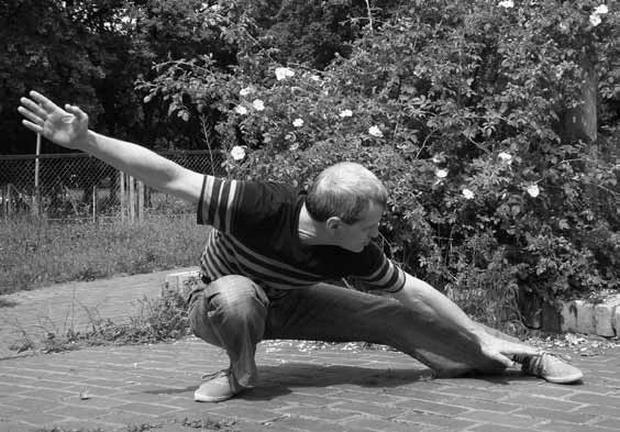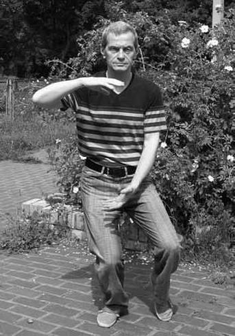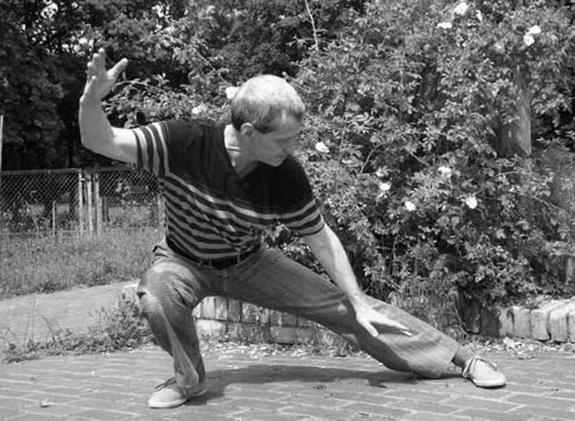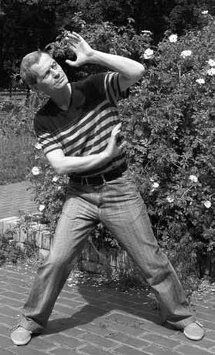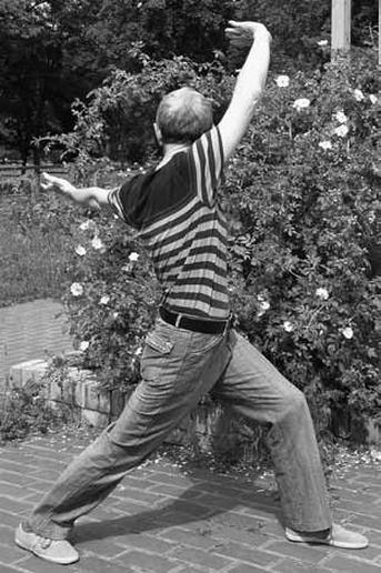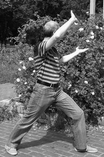 После завершения этого движения перейти из стойки «лук и стрела» в высокую «стойку всадника», для чего поставить стопы параллельно и распределить вес поровну на обе ноги. При этом левая рука сначала движется в направлении шеи, а затем толкает в правую сторону. Одновременно правая ладонь перемещается к левой подмышке, как бы прикрывая ее от удара. При этом стойка понижается, а тело наклоняется вправо (усердствовать с наклоном не нужно, потому что так вполне можно потянуть мышцы).