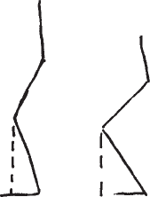 Боясь что-то упустить, я решил вести «конспект». Благо задняя стена дома, скрытая от глаз, была светлой, а припасенный уголек легко оставлял на ней след. Когда У ушел, я сделал «вид сбоку», подразумевая под вертикальной линией ту палочку, которой У «восстанавливал перпендикуляр» из моего колена в основание большого пальца. Я изобразил не только правильный, но и неправильный изгиб колен. Если колени слишком согнуты, то велика опасность их переутомить или даже травмировать.