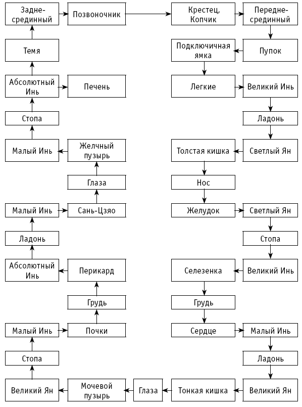 Из приведенных ниже таблицы и схемы становится очевидным, что меняя положение пальцев, можно воздействовать на вход и выход энергии во всех 12 регулярных меридианах.