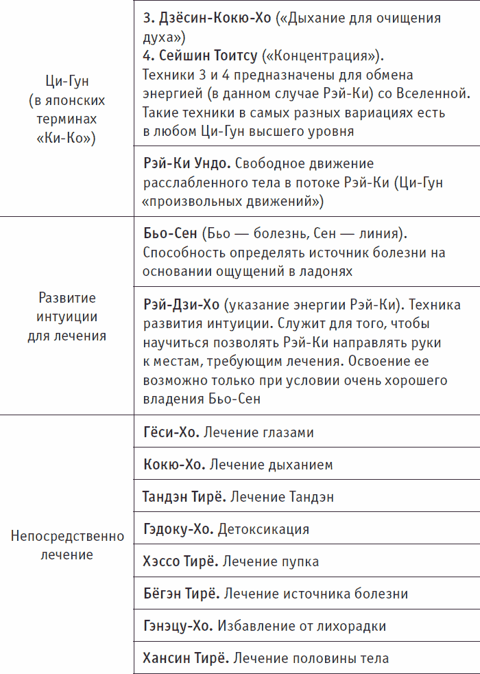 Именно такими блоками (духовная часть, Ци-Гун, движение в Потоке, развитие интуиции для лечения, непосредственно лечение, групповая работа с Рэй-Ки, очищение предметов) мы и будем рассматривать методы Рэй-Ки.