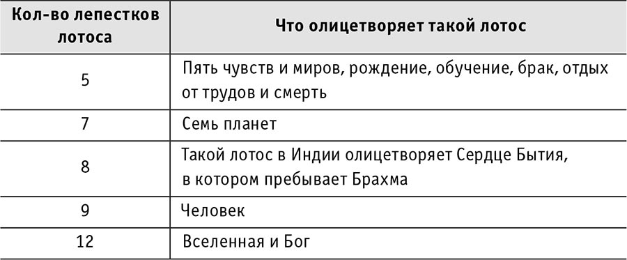 • Лотос существует в трех элементах (Земля, Вода, Воздух). Человек также живет в трех мирах (материальном, интеллектуальном и духовном).