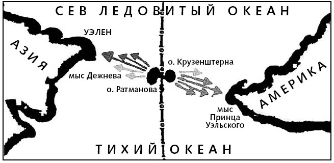 Карта Берингова пролива. Стрелками показано направление движения взрывной волны при сооружении плотины. Рисунок Г. И. Покровского