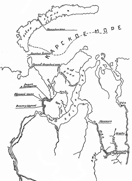 Кроме того, по двум последним вариантам подпирающими мелководную Тазовскую губу создаётся возможность осуществить водный путь по рекам Таз, Русская и Турухан в реку Енисей. Автор отмечал, что, «имея полную возможность маневрировать при посредстве водоспуска у двух полтин, мы в любой момент можем направить тёплые массы воды в нужном, вызывающем в данный момент опасения, направлении»[36].
