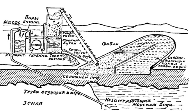 Из-подо льда по трубам, защищённым теплоизолирующим материалом, подаётся внутрь котельного помещения к котлам подлёдная вода. В этих котлах-испарителях – жидкий холодный бутан. Вода впрыскивается, и под действием её тепла (а она теплее бутана, хотя имеет всего температуру в 2°) бутан начинает кипеть. Пары его отводятся по трубопроводу в турбину, а вода, у которой холодный бутан отнимает тепло, замерзает и в виде ледяной крупы падает на дно испарителей, откуда непрерывно выгребается (бутан с водой не смешивается). Пары бутана проходят через турбину и приводят её во вращение, поэтому динамо даёт ток. Далее пары бутана попадают в конденсатор – холодильник, куда непрерывно подаются куски замёрзшего ледяного рассола с температурой –22°. Охлаждаясь, пары бутана сжимаются, а «солёный лёд» нагревается и тает. Жидкий бутан возвращается по трубам обратно в испаритель. Растаявший ледяной рассол выпускается наружу в бассейны и там снова замерзает под действием низкой температуры окружающего воздуха.