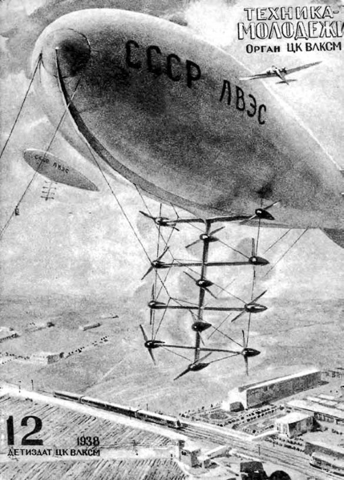 В 1930-е годы активно обсуждалось использование альтернативных видов энергии. В частности – использование энергии ветра. Смелый проект представил инженер В. Егоров на страницах журнала «Техника – молодёжи» в 1938 году. Он предложил создать мощные ветростанции не на земле, а в воздухе, где на высоте 600–700 м над землёй наблюдаются весьма значительные скорости ветра. Ветросиловой агрегат В. Егорова состоял «из двухлопастного ветроколеса, насаженного на один вал с ограничительной муфтой, редуктором и генератором, смонтированными в особом металлическом кожухе, напоминающем по внешности фюзеляж самолёта». Муфта была предназначена «для ограничения вращающего момента при возможных толчках и неожиданных порывах ветра». Редуктор служил «для увеличения числа оборотов, передаваемых от ветроколеса к синхронному генератору переменного тока». Подобную несложную конструкцию ветростанции можно было устанавливать на высокие опоры. Но автор придумал более действенный, по его мнению, способ. Он предложил использовать дирижабли: «К цельнометаллическому корпусу дирижабля подвешивается на стальных тросах система ветросиловых агрегатов. Все агрегаты соединены между собой лёгкими, но весьма прочными металлическими фермами, что препятствует перемещению ветродвигателей друг относительно друга и придаёт жёсткость всей системе подвески в целом. Одновременно эти фермы могут служить и для передвижения обслуживающего персонала»[42].