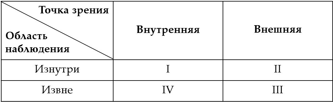 Как правило, наблюдение производится политиком из одной точки, со своей позиции – изнутри, если он находится в ней, или извне, если смотрит на нее со стороны. Однако и сами понятия «изнутри» и «извне» можно рассмотреть как с внутренней, так и с внешней точек зрения. Таким образом, возникают четыре потенциальных позиции наблюдения I–IV (табл. 1). «Мы хорошо знали существующую систему. Знали ее изнутри», – пишет в своей книге М.С. Горбачев29. В таблице 1 это позиция I – наиболее распространенная в реальной политике. «Внутри страны мы ничего не добьемся без коренного изменения отношений с внешним миром», – продолжает он30. Это уже требует перехода к позиции IV. Но остаются и более сложные позиции, и некоторые политики пытаются встать на них, ради более полного понимания ситуации. Такой, например, оказывается позиция II – увидеть себя и ситуацию со стороны. «Не так просто судить о событиях, глядя на них со стороны или, наоборот, оказавшись сильно в них вовлеченным», – признается М.С. Горбачев31. А ведь есть еще и позиция III – взгляд из будущего, когда и сам политик, и ситуация, которую он создает или исправляет, оказались глубоко в Истории (в какой-то мере с такой позиции делается наша попытка взглянуть на декабрь 1991 г., на происходившие тогда события и на М.С. Горбачева в них с сегодняшней точки зрения, более чем три десятилетия спустя; когда-нибудь много позже историки должны будут проанализировать и по-настоящему описать то время; бесценным документом для них послужит книга «Декабрь-91. Моя позиция», для чего мы и обратились именно к ней).