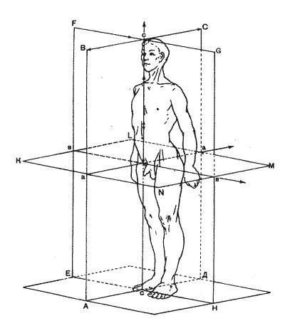 Рис. 2. Оси и плоскости человеческого тела: АВСD – сагиттальная плоскость; EFGH – фронтальная плоскость; KLMN – горизонтальная плоскость; а-а – сагиттальная ось; b-b – фронтальная ось; с-с – вертикальная ось.