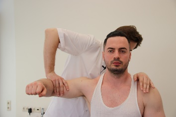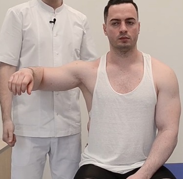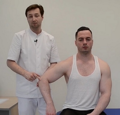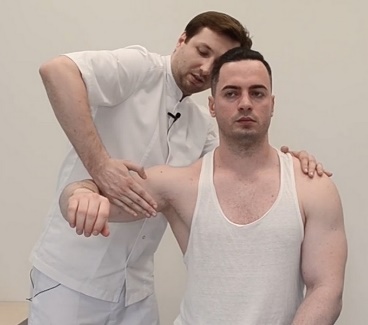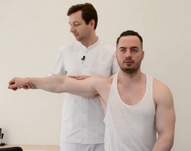 Первый вариант: По команде специалиста пациент, выполняет необходимое движение, активизирующее тестируемую мышцу. Данное сокращение выполняется до адекватного сближения мест крепления мышцы с последующей фиксацией положения – выполнение изометрическое сокращение (например, при тестировании дельтовидной мышцы пациента просят отвести руку в сторону на 90° и удержать ее в этом положении) (рис. 23).