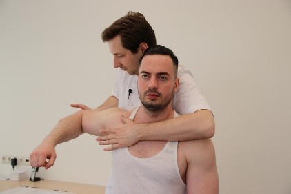 3. Во время проведения тестирования специалист всегда должен помнить о перпендикулярности воздействия тестируемой мышце. Например, если происходит ММТ дельтовидной мышцы, то в состоянии отведения в плечевом суставе на 90° у пациента, специалист должен расположить предплечье своей тестирующей руки, строго вертикально-перпендикулярно руке пациента (рис. 17).