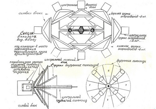 Александр высказываясь, меня поддержал: «Многие очевидцы НЛО утверждают, перед тем, как взлететь тарелки раскручиваются, передвигаясь в воздухе, ярко светятся даже днём. А ещё могут резко менять направление и вообще мгновенно скрыться. Все эти факторы в нашем аппарате как бы присутствуют. Я думаю, более того, я полностью уверен, что у нас всё получится». «Немаловажный вопрос я хочу осветить, – начала сразу Ксения. – Человеческий организм подвержен воздействию сильных внешних электромагнитных полей, которые могут нанести ему большой вред и даже убить его. Поэтому человеку необходима защита. Такой защитой может являться непосредственно капсула пилотов эллипсной формы. Изготовлена она из сплава алюминия и покрыта вся редкоземельными элементами с поверхностной обработкой высокого класса частоты. Второй же активной защитой кабины у нас будет отражающее, направленное зеркало, со своими наружным и многими внутренними соленоидами. Это верхнее самое большое зеркало аппарата». Обсудив всё это, выбрав пути реализации заключительной части построения и испытания нашего подопечного, мы поздно вечером разошлись по домам.