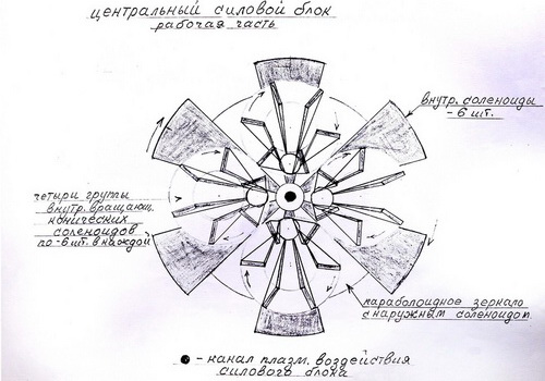 Александр, дополняя меня, добавил: «Если на обмотки блока подать мощный импульс тока и мощный лазерный пучок излучения, то в газовом ионизированном потоке возникает электрический ток, проходя по газу вместе с лазерным излучением и всеми магнитными полями, превращают газ в плазму». «Под совокупным влиянием, – продолжает настойчиво Саша, – всех этих факторов силовых блоков и их орбит, на внутреннем плоскостном кругу