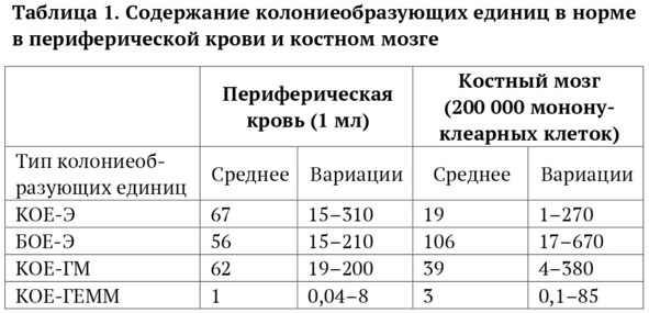 По мере накопления знаний в области изучения клоногенных предшественников были определены нормы количественного содержания различных колониеобразующих единиц при посеве 200 тыс. мононуклеарных клеток костного мозга и 1 мл нормальной периферической крови (табл. 1).