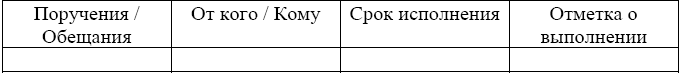 В течение дня фиксировать (любым способом) все поручения, обещания (профессиональные и личные) в таблицу.
