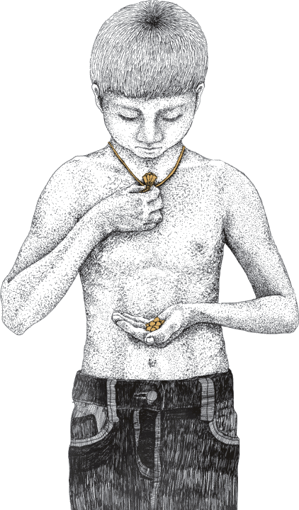 Парень стянул майку, оставшись лишь в нательном кресте на темном шнурке и с холщовым мешочком на груди. Снял, потянул за шнурок.