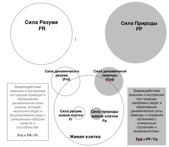 А до тех пор, пока этот вид не появился, взаимодействие внешних и внутренних сил внутри живой клетки, приводит к тому, что на границе ее физической оболочки образовываются динамическая силы природы (Fpd) и динамическая силы разума (Frd). Действия этих сил приводят к изменению формы и содержания живой клетки, а далее и живых организмов. Отчасти, сила динамического разума, это результат взаимодействия внешней силы разума (FR) и внутренней силы разума (Fr), который приводит к образованию нового набора качеств и способностей. Новые качества и способности неизбежно расширяют функции всех новых видов и всех форм жизни.