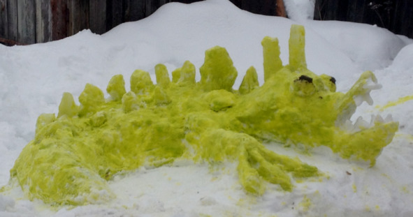Последние дни наступила оттепель, и можно из снега катать огромные комья и лепить снеговиков. Я и Алиса в нашем дворе слепили большущего зубастого и шипастого динозавра. Стали его красить зеленой гуашью, а он получился бледно-желтый, когда краска высохла. Смотри прикрепленный file. Скоро наступят весенние каникулы, и мы с Алисой ждем тебя к нам в гости. Привет маме и папе. Твой брат Степан и сестра Алисочка».