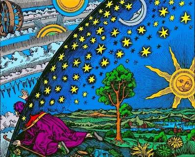 Эту картинку он использовал для иллюстрации того, как, по его мнению, люди представляли себе устройство вселенной в так называемые «средние века». Если небо со звездами – это граница мира или вселенной, то что находится за этой границей?