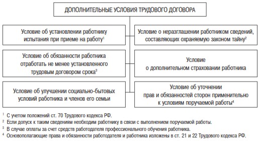 Прежде всего между работодателем и поступающим на работу гражданином должны быть согласованы все условия трудового договора. Подчеркнем, что в данном случае речь идет не только о рассмотренных ранее обязательных условиях, но и о прочих условиях, часть из которых включается в содержание трудового договора в зависимости от характера поручаемой работы по инициативе работодателя. Эти условия трактуются Трудовым кодексом РФ как дополнительные (см. рис. 2.7).