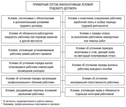 Кроме того, некоторые условия (принято называть их факультативными) могут включаться в трудовой договор по инициативе любой из сторон с учетом конкретных условий выполнения поручаемой работы (см. рис. 2.8).