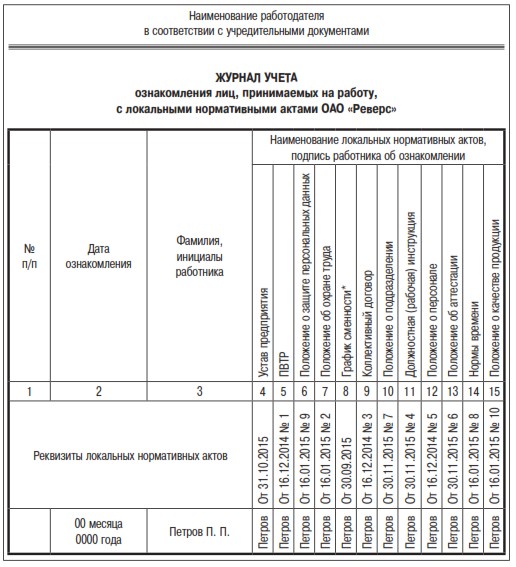 Отметим в этой связи, что в подавляющем большинстве случаев ознакомление работника с коллективным договором, локальными нормативными актами производится с более или менее существенными нарушениями предписываемого Трудовым кодексом РФ порядка. В частности, не всегда работник бывает ознакомлен с указанными документами до заключения трудового договора, расписываясь об ознакомлении задним числом. Характерной ошибкой является и отсутствие в документе, подтверждающем факт ознакомления, сведений, позволяющих безошибочно идентифицировать тот или иной локальный нормативный акт: названия, даты принятия (утверждения), регистрационного номера и т. д.