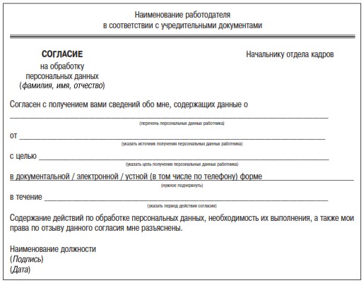 В связи с необходимостью оформления непосредственно после заключения трудового договора учетной документации по труду с использованием персональных данных поступающего на работу гражданина (см. ниже), от последнего должно быть получено письменное согласие на их обработку (предоставление, хранение и т. п.). Примерная форма письменного согласия представлена на рис. 2.10.
