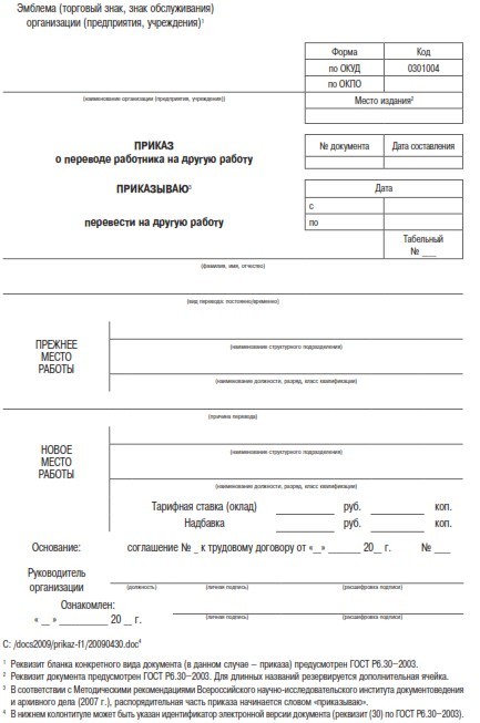 На основании приказа (распоряжения) о переводе на другую работу в трудовую книжку работника вносится соответствующая запись. С содержанием приказа (распоряжения) работник должен быть ознакомлен под роспись в течение 3 дней со дня его издания. Еще одна распространенная ошибка – реализация перемещения работника, фактически представляющего собой перевод на другую работу.