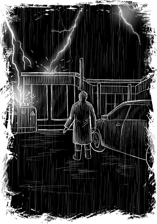 Мне непонятно, что могло произойти, но надо всё-таки выяснить причину. Выхожу на площадку перед нашим «лабораторным комплексом». Сильный ветер. Чувствую, как капли бьют по моему лицу. Машина стоит в одиночестве, и никого, на кого могла бы среагировать сигнализация. Раздается гром. Подхожу к автомобилю и осматриваю его. В кармане вибрирует телефон, и я вспоминаю, как уже однажды уронил его в лужу и к каким последствиям это привело. Открываю машину и сажусь на место водителя, а ключи по привычке кладу в пластиковую нишу возле коробки передач.