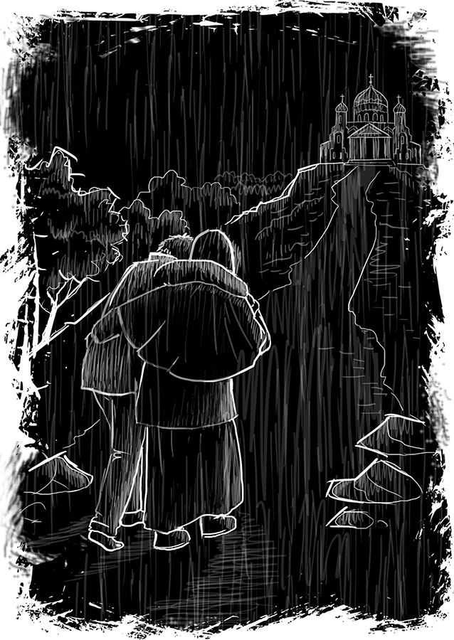 И мы начинаем свое медленное восхождение под дождем. Куда, зачем? Вопросы возникают в моей голове, но я не чувствую ни сил, ни желания задавать их и тем более искать ответы. Все силы уходят на такие простые, но такие трудные для меня движения, как поднять ногу, передвинуть и опустить, снова поднять, передвинуть и опустить. Мышцы, забывшие всего лишь на две недели, что такое сокращаться, не хотят подчиняться моей воле. Крестная поддерживает меня, и мы снова делаем шаг. Почему купель и источник находятся в низине? Мне кажется, что моих сил не хватит на то, чтобы мы поднялись. Смотрю на тропинку, убегающую вверх, и задача, которая поставлена передо мной, кажется мне невыполнимой. Мозг сдается, не хочет участвовать в этой авантюре. Но я слишком хорошо знаю его особенности и физиологию, и мне не в первый раз заставлять его делать то, что хочу я. Надо его обмануть, заставить работать для того, чтобы помочь мне, и я точно знаю как. Непосильную задачу нужно разбить на маленькие подзадачи и решать их по одной, делая небольшой перерыв, и тогда результат будет достигнут. Чаще всего человека сминает невозможность выполнить определенный объем работ, и тогда мозг сдается. Мысленно рисую для себя линию, дойдя до которой нужно будет остановиться и сделать небольшой привал. Мозг, почувствовавший реальность достижения поставленной цели, активизируется, запускает резервы, включает мышцы, и вот мы уже на обозначенной точке. Делаем небольшой перерыв, а я снова провожу мысленную линию, и всё повторяется.