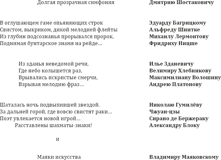 Долгая прозрачная симфония…Музыкальные штормы тревог…Шелест дождя на холодном ветру историиОткрывает созвучия первородных бунтующих нот!Стирается грань между звуком и светом,Тремоло метелей дрожит над Невой…Аккорды буранов сметают планету,Конкорды концертов парят над страной…Огромный, пронзительный, бурерождённыйВрывается мир в контрапункты судьбы,И, словно мелодия, стих осенённыйЧерешневым звоном ложится в листы…ДДолгая прозрачная симфония,Возможно, сломавшая ход войны…Ведь вослед её звукам отступала агония,И все понимали, что неизбежен приход весны…И пусть оркестранты дрожали от голода,Но бил барабанов тревожный бой,И в горькие ноты осаждённого городаКак ветер надежды врывался гобой…И белые птицы кружили стаями,И жизнь начинала иной виток!И отступали, дробились, таялиМузыкальные штормы тревог…ММузыкальные штормы тревогИзменяют пространство и время,Искривляют маршруты дорогИ ломают клише устремлений!Пассакальи торжественный тон[1]Начинает скупое движенье…То ли стих, то ли марш, то ли стон,То ли просто его отраженье! На весах-коромысле качается звук, Отмеряя то радость, то горе… и Начинается гулкий смятенный стук — Шелест дождя на холодном ветру истории…ШШелест дождя на холодном ветру истории,Песня кукушки, беспокойство, шум бурь…И в гимнах этой странной лесной ораторииПроступает неведомый, неземной сумбур[2]…Уже не мелодия, но её превышение —Выход за пределы восьми октав!Почти невозможное произведение,Где звуки взрываются, музыкой смерть поправ!И вот тогда начинается новая эра!И Ной-Композитор спускает плотВо вселенский хаос, где наша земная сфераОткрывает созвучия первородных бунтующих нот!ООткрывает созвучия первородных бунтующих нотПианист – пилигрим по иным мирам,Где гармония держит хрустальный свод,Под которым стоит колокольный храм!Где с амвона для паствы звучат стихи!Где теряют все смыслы и низ, и верх!Где Вергилий ведёт на свои кругиПо тернистым путям музыкальных вер!Где привычные ритмы идут на слом! Где пурга рассыпается в снег сонетом! Где сонатою грозной рокочет гром! И…Стирается грань между звуком и светом!ССтирается грань между звуком и светом!Космический поднят шлюз!Сегодня молитвой, псалмом, заветомЗвучит планетарный блюз!Сегодня в аллегро играют птицы!В адажио – гул песка!Сегодня уйдёт за разрыв страницыОтчаянье, боль, тоска!Сегодня поэт, музыкант, искательСчастливый идёт домой…И в ломкой рапсодии лунных капельТремоло метелей дрожит над Невой…ТТремоло метелей дрожит над Невой!Вода разбивает лёд!И где-то там, за седой волной,Вскрывается древний код!Вскрывается белый солярный шум,Сдувающий облака!И флейта неба тревожит умИз дальнего далека…И сочинитель набатных строфЗвенящие ставит меты…Поверх барьеров и катастрофАккорды буранов сметают планету!ААккорды буранов сметают планету!Вьюжит колокольный стон!Звонарь всю культуру зовёт к ответуЗа бред смертоносных войн!Нашествию чёрного зла и мрака,Безумию тёмных силОн возражает всей силой взмахаСвоих музыкальных крыл…К суду призывается диктатураИ весь социальный строй!И кружится в небе войны партитура[3],Конкорды концертов парят над страной…ККонкорды концертов парят над страной!Перкуссии бьют в набат!Симфония снежной густой пеленойВрывается в Ленинград!И в залпах орудий, литаврах битвГремит вселенский оркестр!