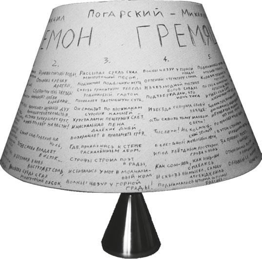 Специально для этого проекта я создал поэму, посвящённую Лермонтову, «Демон гремящего паруса», которую написал по кругу на абажуре настольной лампы. Поэма светилась своим внутренним светом и отбрасывала свои лучи на все экспонаты выставки.