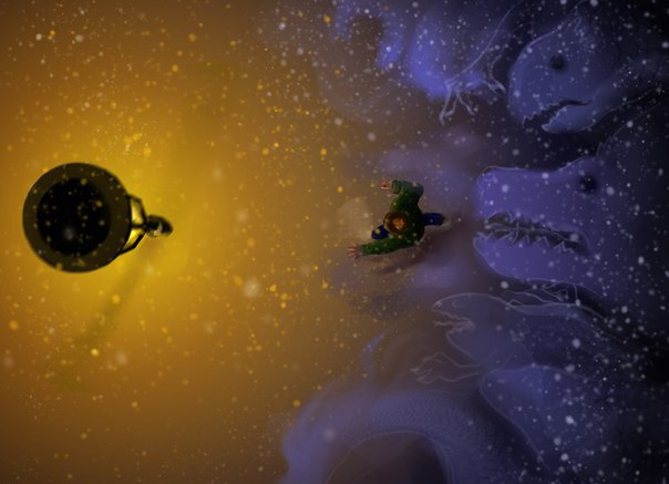 Муна поразили огромные снежные холмы, покрывшие землю. Он оказался будто бы посреди застывшего моря, извергшего гигантские волны в минуту шторма. Мальчик потеплее обмотался шарфом и начал забираться на один из холмов. Снег на удивление оказался достаточно плотным, и Мун, к счастью, не проваливался при каждом шаге. Ни фонаря, ни его света, естественно, видно не было, но мальчик был уверен, что с курса не сбился. Надо было просто идти по этому морю с возвышающимися со дна деревьями.
