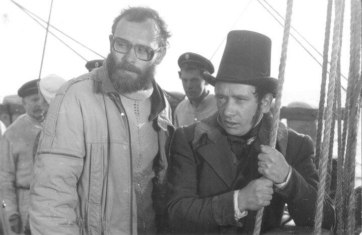 На съемках фильма «Странник». На переднем плане (слева направо): режиссер М. В. Ведышев, В. Гемс в роли судового врача. 1987 г.