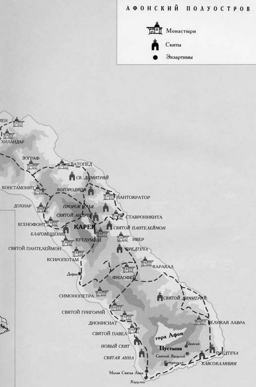 Святая Гора Афон имеет особый статус не только в Греции, но и во всем православном мире. По преданию, гористый полуостров, имеющий 80 км в длину и 16 км в ширину, был взят под свой омофор Божией Матерью, отчего его часто называют «земным уделом Богородицы». Греческая конституция признает административную автономию расположенных здесь монастырей, а гражданский губернатор полуострова, назначаемый греческим правительством, не имеет права вмешиваться в их внутренние дела. Все афонские монастыри находятся в юрисдикции Вселенского Патриарха, вне зависимости от их национальной принадлежности. Согласно уставу на Афоне имеется 20 Патриарших ставропигиальных монастырей, из них 17 греческих: Великая Лавра прп. Афанасия Афонского, Ватопед (во имя Благовещения Пресвятой Богородицы), Ивирон (бывший грузинский Иверский монастырь в честь Успения Богородицы), Дионисиат (во имя Рождества Иоанна Предтечи), Кутлумуш (в честь Преображения Господня), Пантократор (в честь Преображения Господня), Ксиропотам (во имя Сорока мучеников Севастийских), Дохиар (во имя свв. Архангелов), Каракал (во имя свв. Апостолов Петра и Павла), Филофей (в честь Благовещения Пресвятой Богородицы), Симонопетра (в честь Рождества Христова), Ставроникита (во имя свт. Николая Чудотворца), монастырь св. Павла (в честь Сретения Господня), Ксенофонт (во имя вмч. Георгия Победоносца), Григориат (во имя свт. Николая Чудотворца), Эсфигмен (в честь Вознесения Христова), Кастамонит (во имя св. первомч. Стефана), а также русский монастырь вмч. Пантелеимона (Русик), болгарский Зограф (во имя вмч. Георгия Победоносца) и сербский Хиландар (во имя Введения во храм Пресвятой Богородицы). Только эти 20 обителей имеют права собственности на Святой Горе.