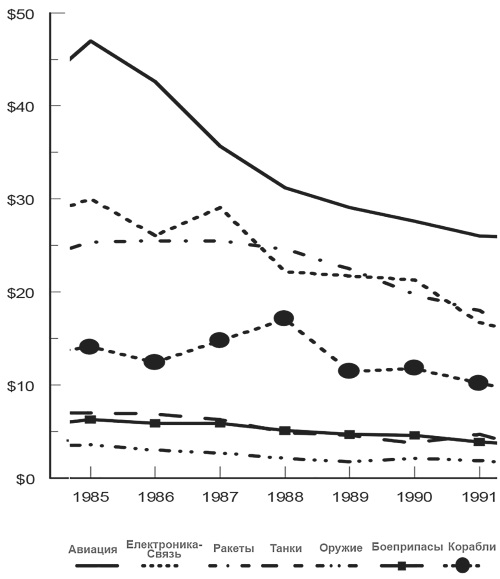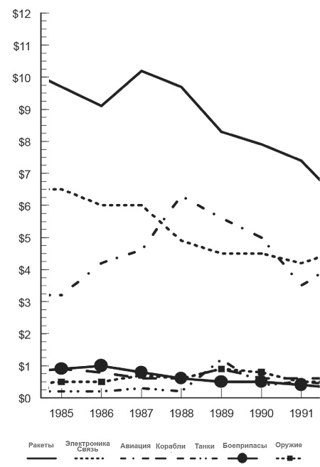 Не столь однозначно выглядела картина с расходами на исследования и разработки. Ниже приведен график, показывающий динамику контрактов Министерства обороны США на НИОКР по основным системам вооружений в 1985–1991 годах (в долларах 1995 года). Как видно из графика однозначное падение имело место лишь в двух категориях. В области ракетной техники расходы на НИОКР сократились с примерно 10 млрд до примерно 7 млрд долларов. В категории «электроника и связь» падение произошло примерно с 6,5 млрд до 4,5 млрд. Незначительное сокращение произошло в сфере боеприпасов. Во всех остальных категориях процесс шел неравномерно: падение сопровождалось ростом и наоборот.