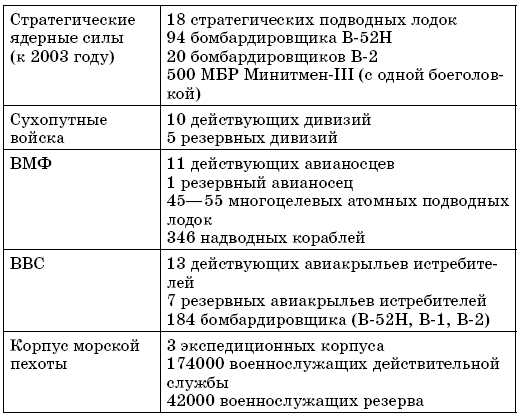 Если сравнить эти данные с теми, что были представлены в «Национальной военной стратегии» предыдущей администрации, то можно сделать вывод, что администрация Б.Клинтона планировала еще более глубокие сокращения вооруженных сил. Так, количество МБР уменьшалось с 550 до 500 единиц. Число действующих дивизий сухопутных войск сокращалось с 12 до 10, а резервных с 6 до 5. Ничего не говорилось про две кадрированные дивизии. Видимо, они тоже должны были быть упразднены. В ВВС вместо 15 действующих авиакрыльев оставалось 13, а вместо 11 резервных – 7. В ВМФ общее количество надводных кораблей должно было уменьшиться с 450 до 346 единиц. Причем, один из 12 остающихся авианосцев должен был перейти в резерв.