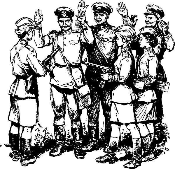 Командир поднял голову и, ни слова не говоря, пристально всматривался в «пленных».