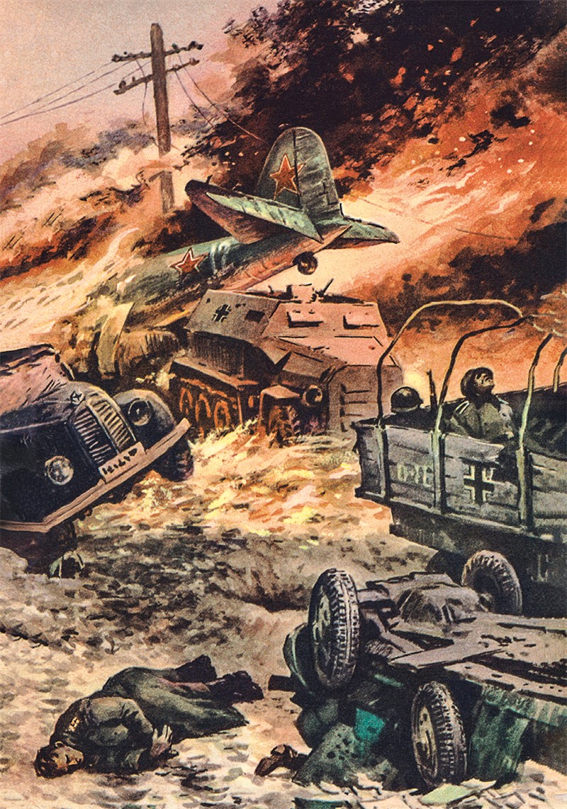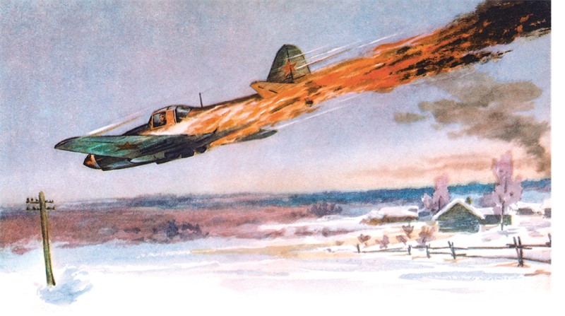 Самолёт, конечно, не мог дотянуть. Уже загорелся хвост машины. Лётчик развернул свой «Ил», снизился и, летя над большаком, забитым вражескими войсками, стал стрелять по ним из пушки. Фашисты бросились врассыпную. А лётчик взмыл ввысь на пылающей машине и оттуда ринулся на фашистов.
