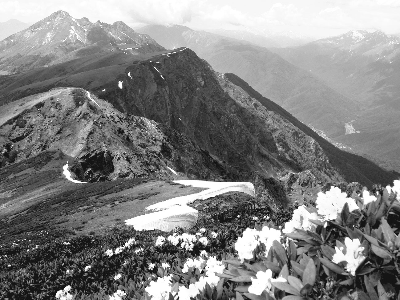 В июле на субальпийских лугах начинается массовое цветение. Цветут белые, с легким розовым оттенком, горные анемоны, розовые астры, синие васильки, лиловые буквицы, розово-красный горлец. Огромные пространства покрываются яркими коврами разнообразных цветов. Но эти субальпийские луга не только красивы своим буйным цветением, они являются прекрасными пастбищами для скота. Много цветов и в лесах. Особенно красивы в период цветения заросли кавказского рододендрона. Этот цветочный кустарник оплошным массивом врезается в полосу субальпийских лугов. Массовое цветение его начинается в середине июня. Белые, иногда нежно-розовые или кремовые, крупные цветы его густо покрывают кустарник и представляют собой замечательное зрелище.