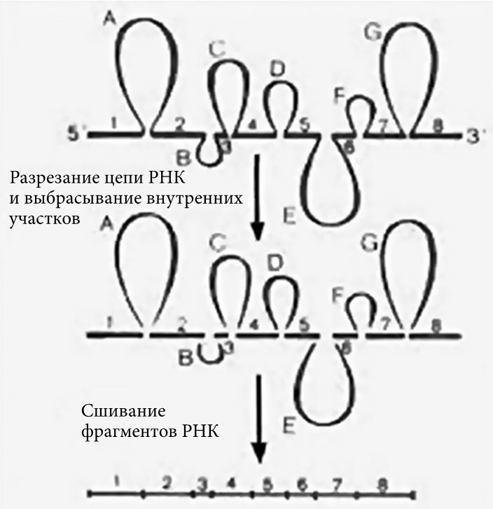 Достаточно вспомнить о том, как происходит передача информации, записанной в ДНК. ДНК всегда скручена в узлы, обладающие сложной топологией. Эта конфигурация ДНК – значимая форма. Эта форма в зависимости от среды, в которой находится ДНК (состава в ней солей, щелочей и т. д.), меняется, ДНК сворачивается иным образом в иные узлы. С этой самой ДНК значимые для передачи информации участки переносятся на рибонуклеиновую кислоту. Из-за того что ДНК так свернута, в ней есть участки, которые можно считать и скопировать, а есть такие, которые спрятаны в глубине узлов и недоступны для переноса на РНК. Эти скрытые участки называются интронами, в них заключена спящая информация. А доступные для копирования участки называются экзонами, и с них происходит печать. РНК несет на себе копии экзонов и пустые участки, соответствующие интронам. Возникает странный рисунок, состоящий из зон: тех, что смыслом обладают, и тех, которые им не обладают. А затем происходит усечение, вырезание пустых мест, так называемый «сплайсинг». Пустые места вырезаются, и возникает дубль, который называется «матричная РНК». Это то, что имеет смысл, это РНК, из которой вырезаны пустоты. И уже эта матричная РНК несет команду рибосомам, в которых печатаются протеины и так далее.