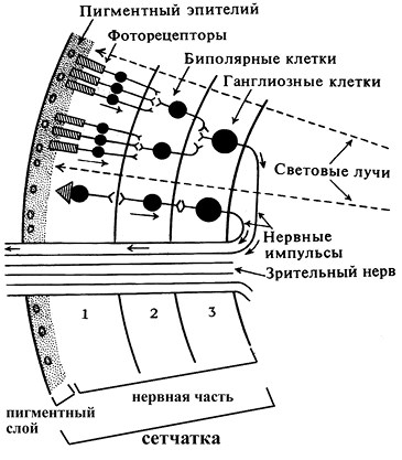На сетчатке колбочки доминируют на узком пространстве этой ямки. В самой сетчатке очень много сосудов, через которые должен проходить свет и которые мешают видеть. В центре же ямочки сосудов нет, тут все вычищено, чтобы в нее свет мог проникнуть без помех.