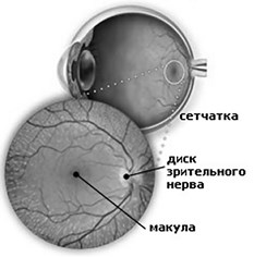 Кроме того, к сетчатке подходит зрительный нерв, по которому сигналы из глаза идут в мозг. К нему тянутся от клеток нервные волокна. В том месте, где зрительный нерв подсоединяется к сетчатке, – это место называется зрительным диском – вообще нет светочувствительных клеток, это слепое место. Здесь мы ничего не видим. А немного в стороне от него расположена так называемая макула, пятнышко диаметром примерно 5 мм. Внутри нее есть ямка, она называется центральная ямка. В этой крохотной центральной ямке сосредоточено наше дневное зрение, колбочки, способность различать детали, видеть цвет.