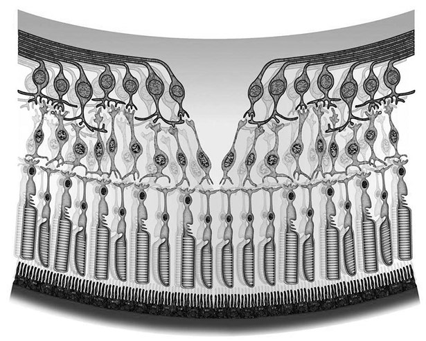 Поэтому мы должны все время сканировать мир. Глаз все время движется, чтобы в поле зрения макулы попало как можно большее пространство. Устойчивость картинки мира обеспечивается специальными «стабилизаторами зрения», позволяющими нам не замечать эти движения глаза. Когда мы двигаем головой, благодаря этой системе стабилизации мы не имеем скачка изображения. Давайте посмотрим, что происходит в этой ямке. В ней нет этих горизонтальных или ганглиозных клеток, все расчищено, свет подходит непосредственно к светочувствительным клеткам, туда, где находятся сплошные колбочки.