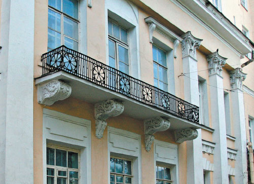 Напротив Музея архитектуры, на солнечной стороне Воздвиженки, так говорят в Петербурге применительно к Невскому, расположены бывшие владения Шереметевых. Участок, разрезанный Шереметевским переулком, ныне – Романов переулок, состоял из старого дворца (Романов пер., 2/6, стр. 3), поставленного в 1780-е годы фасадом на Воздвиженку в глубине участка за большим парадным двором, и нового дворца, его чаще называли наугольным домом (Воздвиженка ул., 8/1, стр. 1), построенного на углу Воздвиженки и переулка в 1790-е годы. Здесь жил владелец Кусково и Останкино Николай Шереметев, здесь праздновал он женитьбу на своей крепостной актрисе Прасковье Жемчуговой. Наугольный дом сохранился. Это одно из немногих зданий с допожарными деталями на фасаде. Большой дворец также стоит, но полностью заслонен зданием Кремлевской больницы.