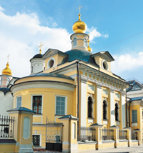 Бывший главный дом усадьбы Шереметева занимает столь секретная организация, что и с Романова переулка дворец не увидеть. Из-за высокого забора торчит только кусочек фронтона бокового ризалита (Романов пер., 2/6, стр. 3). Но дворец можно обойти и посмотреть на него сзади. Из Романова переулка мы поворачиваем направо во двор и видим непритязательную заднюю сторону огромного дворца и изящную церковь Знамения на Шереметевом дворе (Романов пер., 2/6, стр. 8). Церковь была домовой, а построена она в конце 1680-х годов тогдашним хозяином участка Львом Нарышкиным. Такой стиль как раз и называют нарышкинским барокко, ведь храмы в Москве по новой моде начали строить именно представители этой семьи. Церковь Знамения несет почти все элементы нового стиля: храм приподнят на высокое гульбище, состоит из трех восьмериков, поставленных пирамидой на четверик. Два верхних яруса отданы под колокола. Стены украшены шестигранными окнами. На карнизах белокаменные резные «петушиные гребни». Барабаны, граненные по западной традиции.