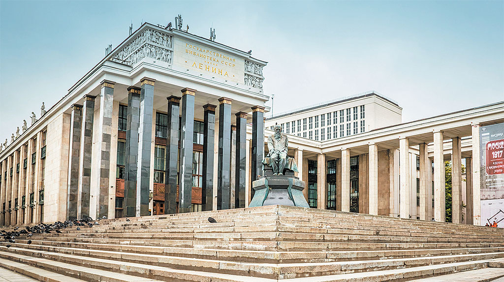 Революция разорила тысячи граждан, а вот музей обогатился. За счет переданных, брошенных и отобранных коллекций фонды музея выросли с 1 миллиона 200 тысяч единиц хранения до 4 миллионов. Дом Пашкова стал мал. Решили все, как говорится, непрофильные собрания передать в другие музеи, а здесь оставить только книги. Так Румянцевский музей стал Библиотекой имени Ленина. Был объявлен конкурс на новое здание Ленинской библиотеки, в котором участвовали ведущие архитекторы того времени. Проекты были авангардные, все-таки на дворе стоял 1928 год. Но выиграла работа Владимира Щуко и Владимира Гельфрейха. Именно они верно отразили дух времени – возвращение классической архитектуры. Архитекторы поставили корпуса библиотеки углом с отступом от перекрестка (Воздвиженка ул., 3/5, стр. 3). Получилась парадная площадь с колоннадой по периметру. Над главным входом двухуровневый мраморный фриз – классическое шествие с плодами труда в руках. В соответствии со статусом соавторов верхний ряд вырезан по эскизу Щуко, нижний – по рисунку Гельфрейха.