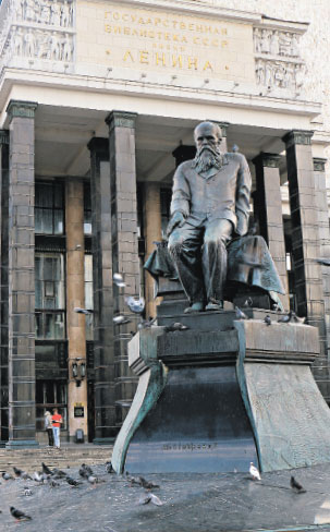 На террасе перед библиотекой в 1997 году был установлен памятник Достоевскому работы Александра Рукавишникова. Этот автор поставил за последние годы в столице больше 30 скульптурных групп. Число впечатляет, также впечатляет не частое во все времена совпадение таланта и востребованности. Москвичи сразу стали потешаться над памятником писателю. Иронизировали по поводу его болезненной позы, словно Достоевский ерзает от колик. Кто-то из профессионалов сказал, что не понимает, на чем сидит писатель, мол, под ним странный архитектурный облом, накрытый скатертью. А на постаменте вообще изображена Нева, хотя Достоевский родился в Москве и его многое связывает с нашим городом. Я тоже соревновался в остроумии… Но по прошествии двадцати лет, сравнивая Достоевского с другими новыми и в основном безликими монументами, я радуюсь, что писатель такой неоднозначный, что было время, когда можно было ваять сложный образ, и что на фоне Кремля видна не очередная победная фигура с мечом, а согбенная спина писателя-страдальца.