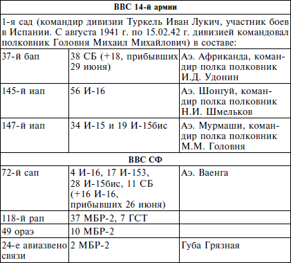 ВВС 14-й армии и приданными частями ВВС Северного флота командовал талантливый пилот, генерал-майор авиации Александр Кузнецов. 22 июня 1941 года советские авиационные подразделения, защищавшие арктическую зону и Кольский полуостров, располагались следующим образом: